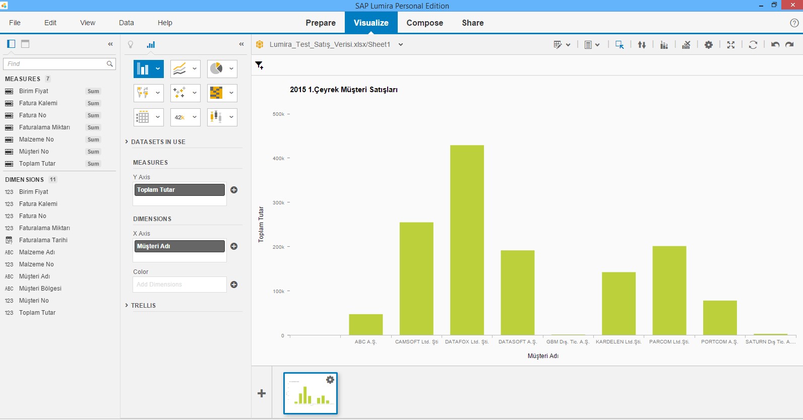 Verilerin Lumira’ya alımı tamamlandıktan sonra görselleştirme adımına geçilebilir. Ekran görüntülerinde de görüleceği üzere Visualize (görselleştirme) adımında veri kaynağınız içerisinde gelen parametreler ile grafiklerinizi düzenleyebilir, ekranın alt kısmında gelen + butonuna basarak birden fazla tasarım oluşturabilirsiniz.