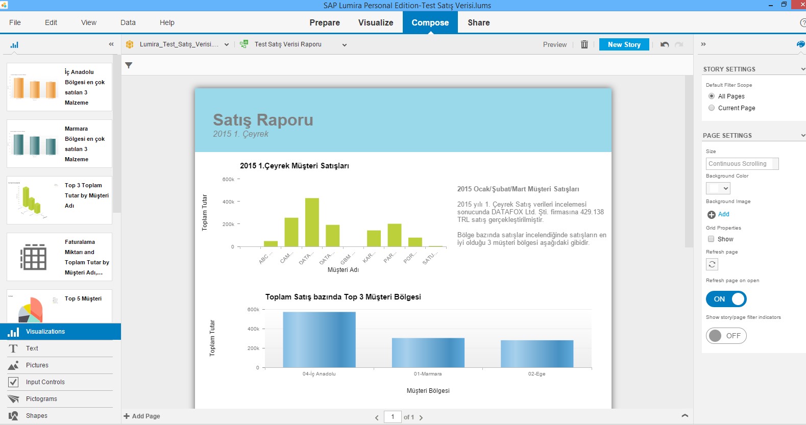Aşağıdaki ekran görüntülerinde de göreceğiniz üzere kısa da olsa birkaç adımda bilgisayar donanım ve gereçlerini satan bir şirketin faturalama verilerini excel üzerinden Lumira’ya upload ederek basit bir raporu görselliği de ön plana çıkararak elde etmeyi hatta raporu pdf olarak masaüstüne kaydetmeyi anlatacağım.