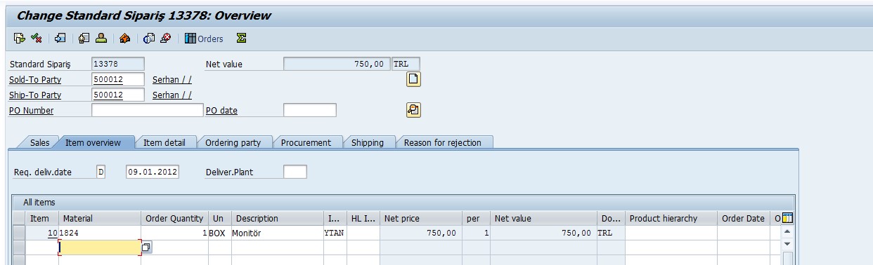 13378 numaralı siparişinizin sistemde yaratıldığını görebilir ve VA02 trx ile giderek siparişinizi kontrol edebilirsiniz.