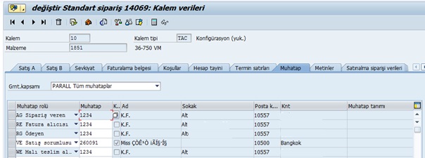 Örnek olarak 2 farklı Satış Siparişimizde kalem verileri içinde bulunan Muhatap sekmesinde;